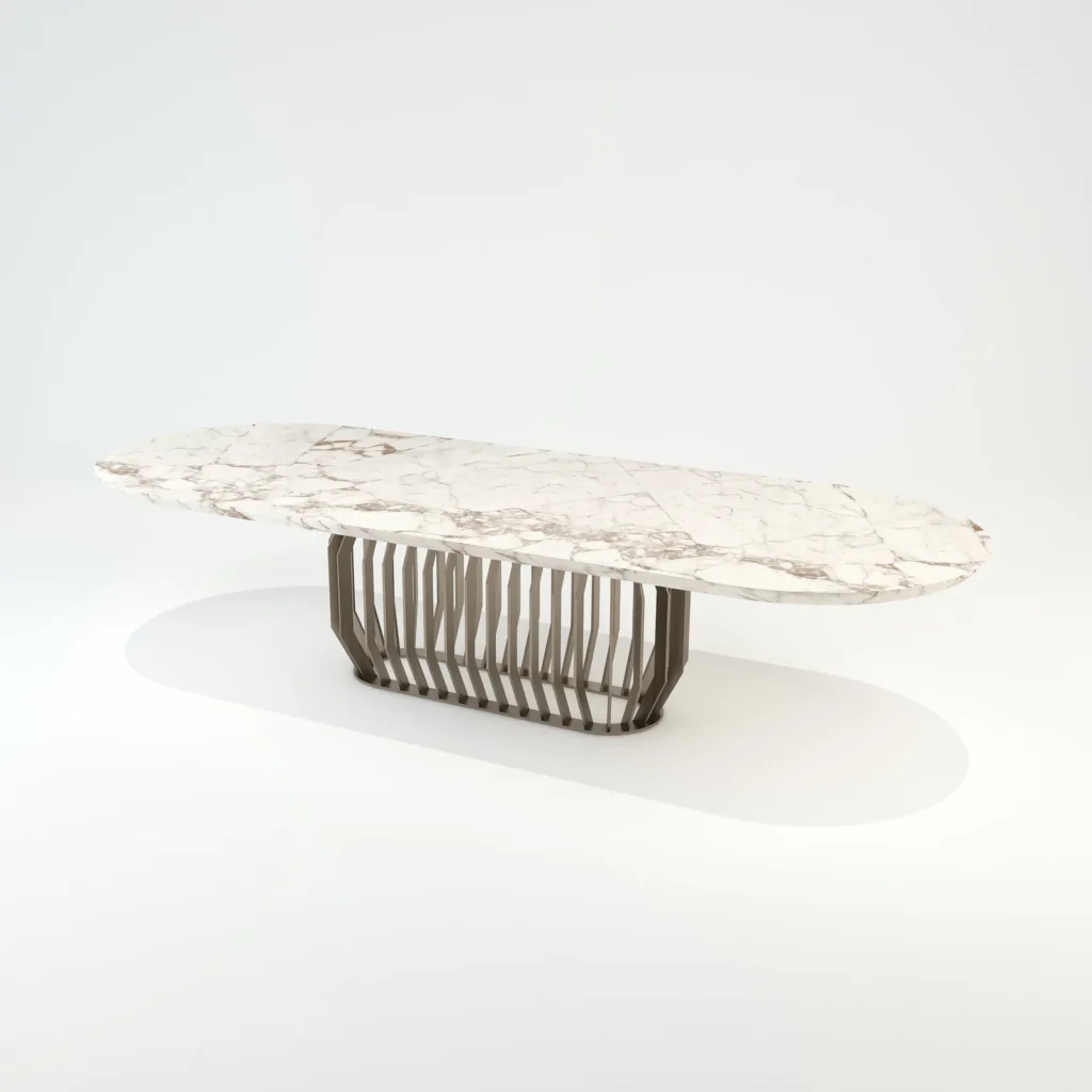 Table with sculptural base made with metal elements in satin bronze finish. Oval top in Calacatta Gold marble with beveled edge. Other finishes available on our catalogue